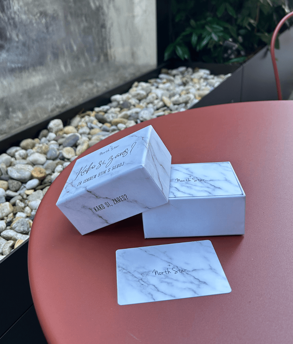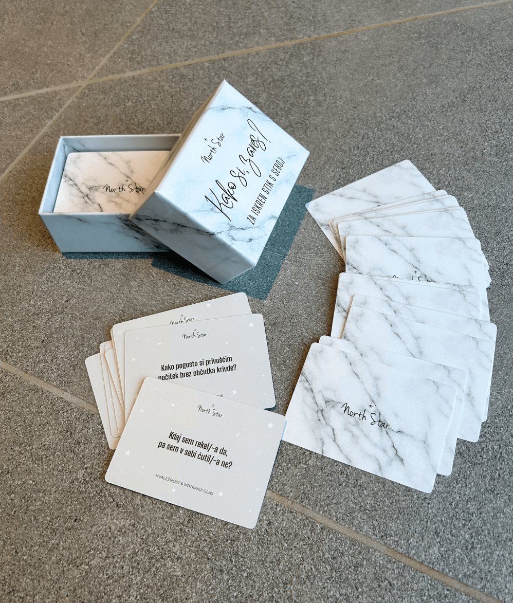 V škatlici “Kako si, zares?” je 100 kartic z vprašanji, ki nas spodbudijo, da se ustavimo in prisluhnemo sebi. V svetu, kjer vse pogosteje poslušamo zato, da bi odgovorili – ne zato, da bi razumeli –, nas kartice nežno usmerjajo k razmisleku o tem, kdo sploh smo, kaj nas žene, kje se ustavimo in kaj si želimo. Kartice niso rešitev, ampak začetek. Začetek iskrenega pogovora – s seboj.